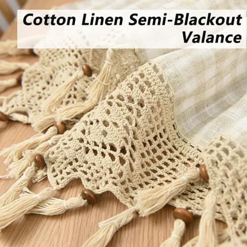 Valance for Window Lattice Short Curtain - Cotton Linen Beige Valences with Tassels for Cafe Bedroom Living Room Decor Beige, H 15 inch × W 60 inch, USBELFF