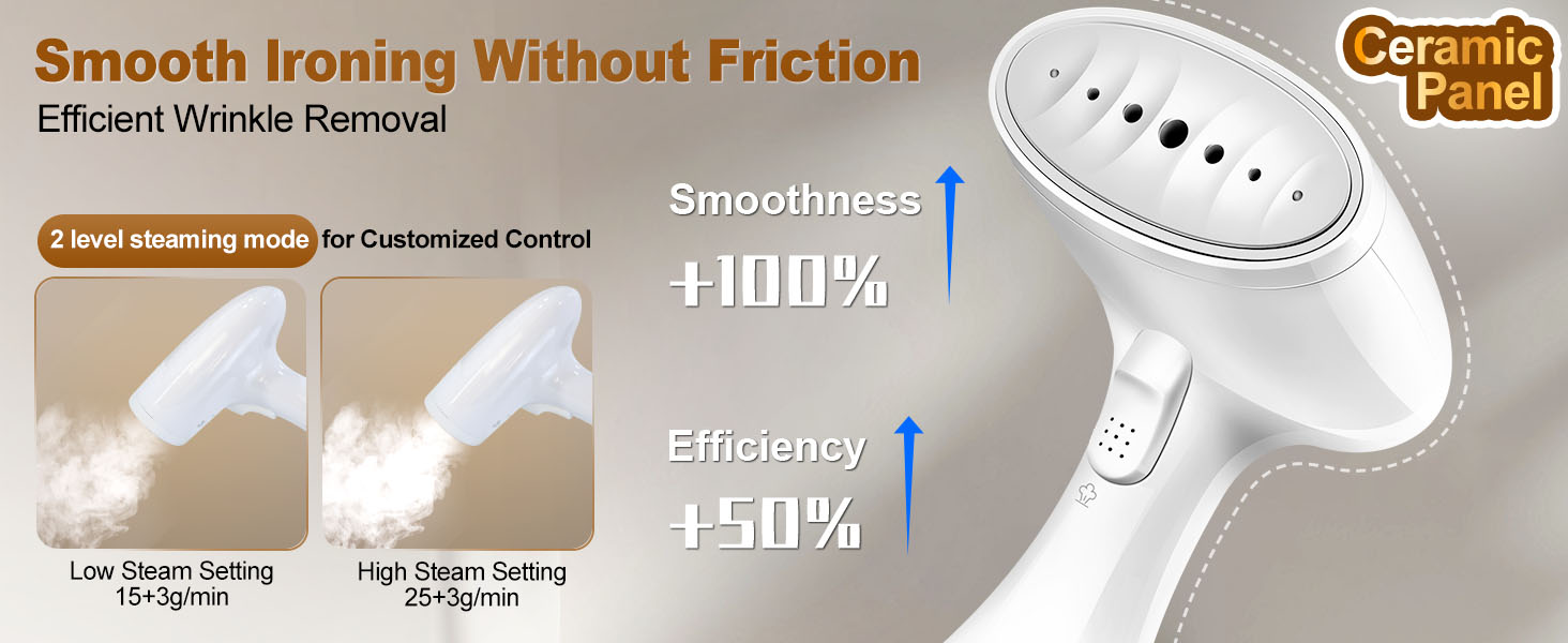【Continuous Steam & Adjustable Steaming Mode】This handheld clothes steamer has continuous steam function. Press the steam button and preheated for 25s for firstly continuous steam. High Steaming mode designed for thick fabrics such as wool, denim, cotton and plush material. Low Steaming mode designed for thinner fabrics such as silk, linen, nylon, etc.