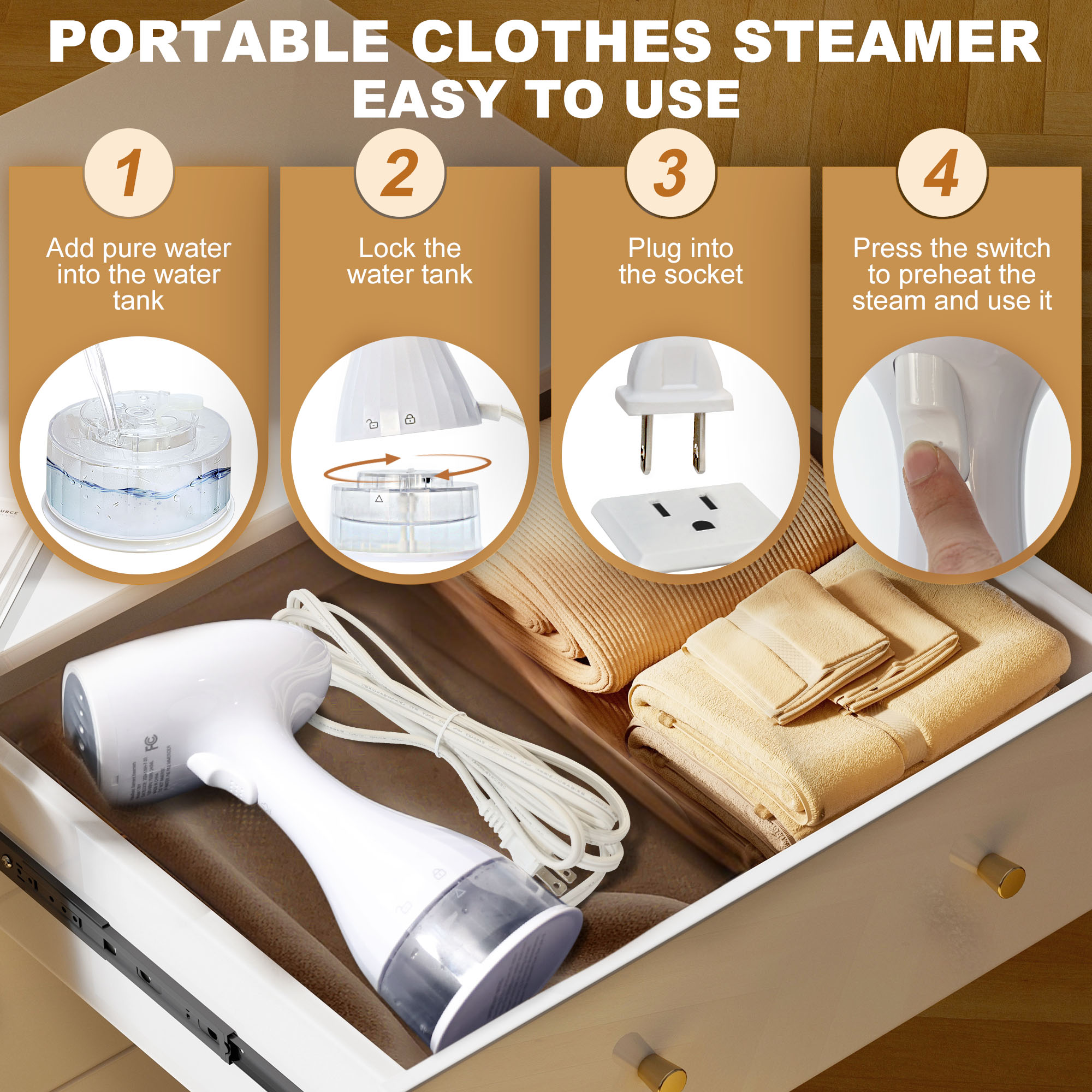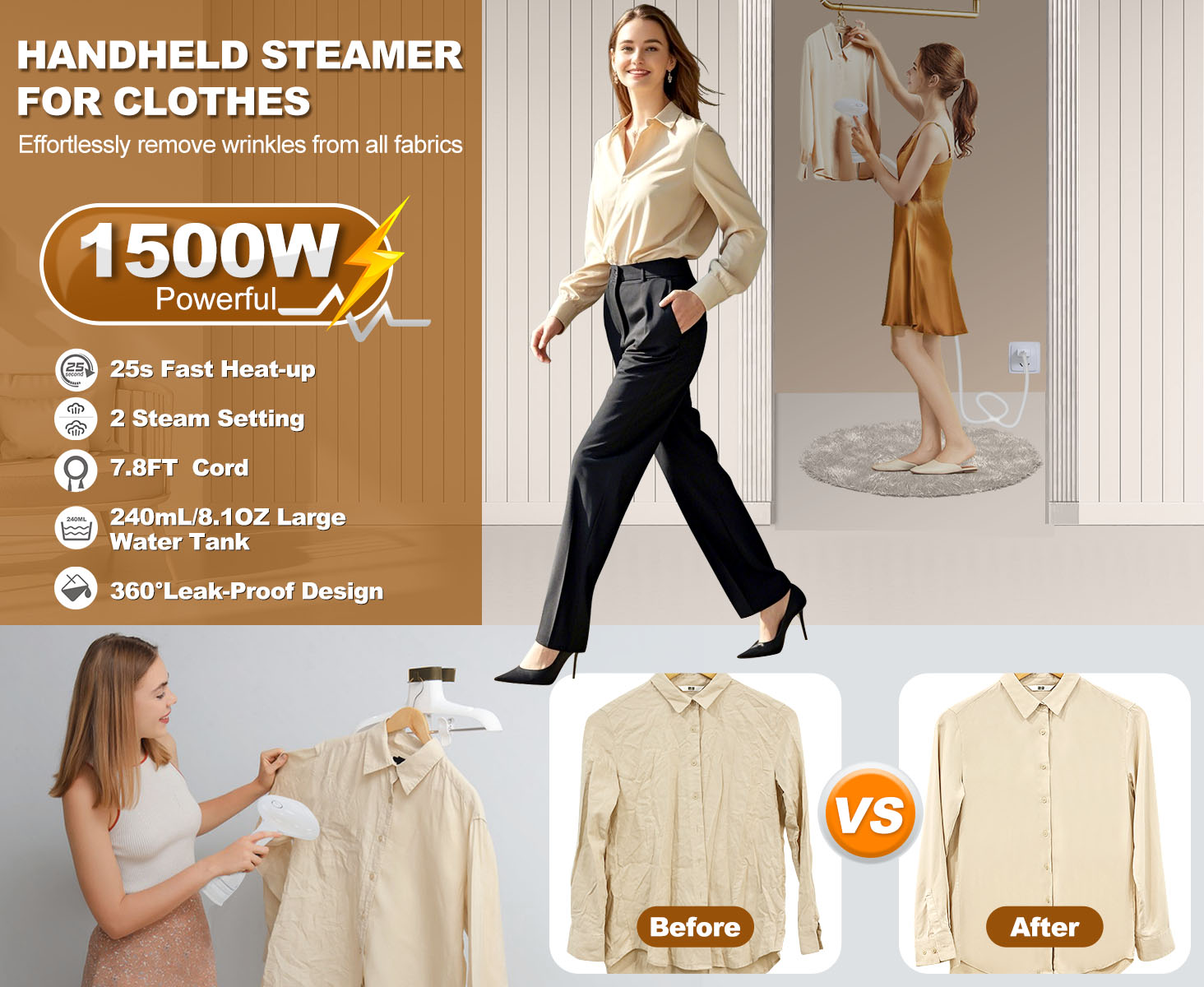 【360° Leak-Proof Design for Hang & Flat Steaming】The clothes steamer features a 360° anti-leak design, allowing for vertical or horizontal use without spills or drips. Enjoy a safe and clean ironing experience with this handheld steamer for clothes